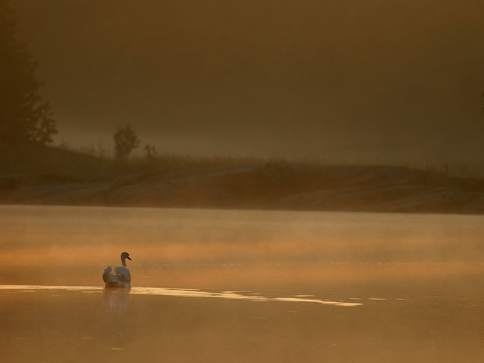 Schweden 2003, Kvädö, 5:00 Uhr. In den ersten Sonnenstrahlen beginnt ein Schwan den neuen Tag.