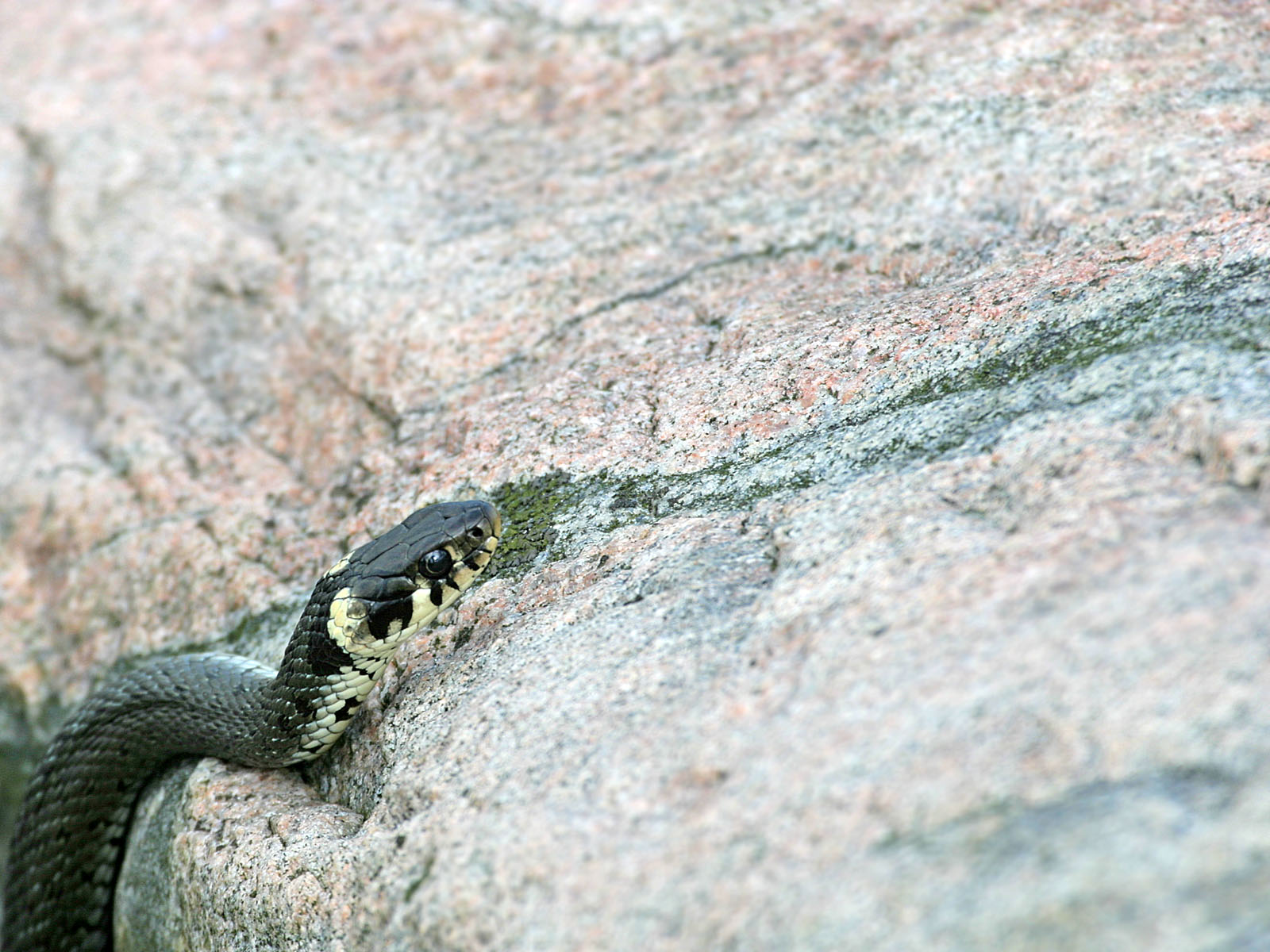 Ringelnatter - diese für den Menschen absolut ungefährliche Schlange erkennt man am besten an den gelben Flecken am Kopf. Und wenn man sich ganz ruhig verhält, lässt sie sich auch fotografieren.