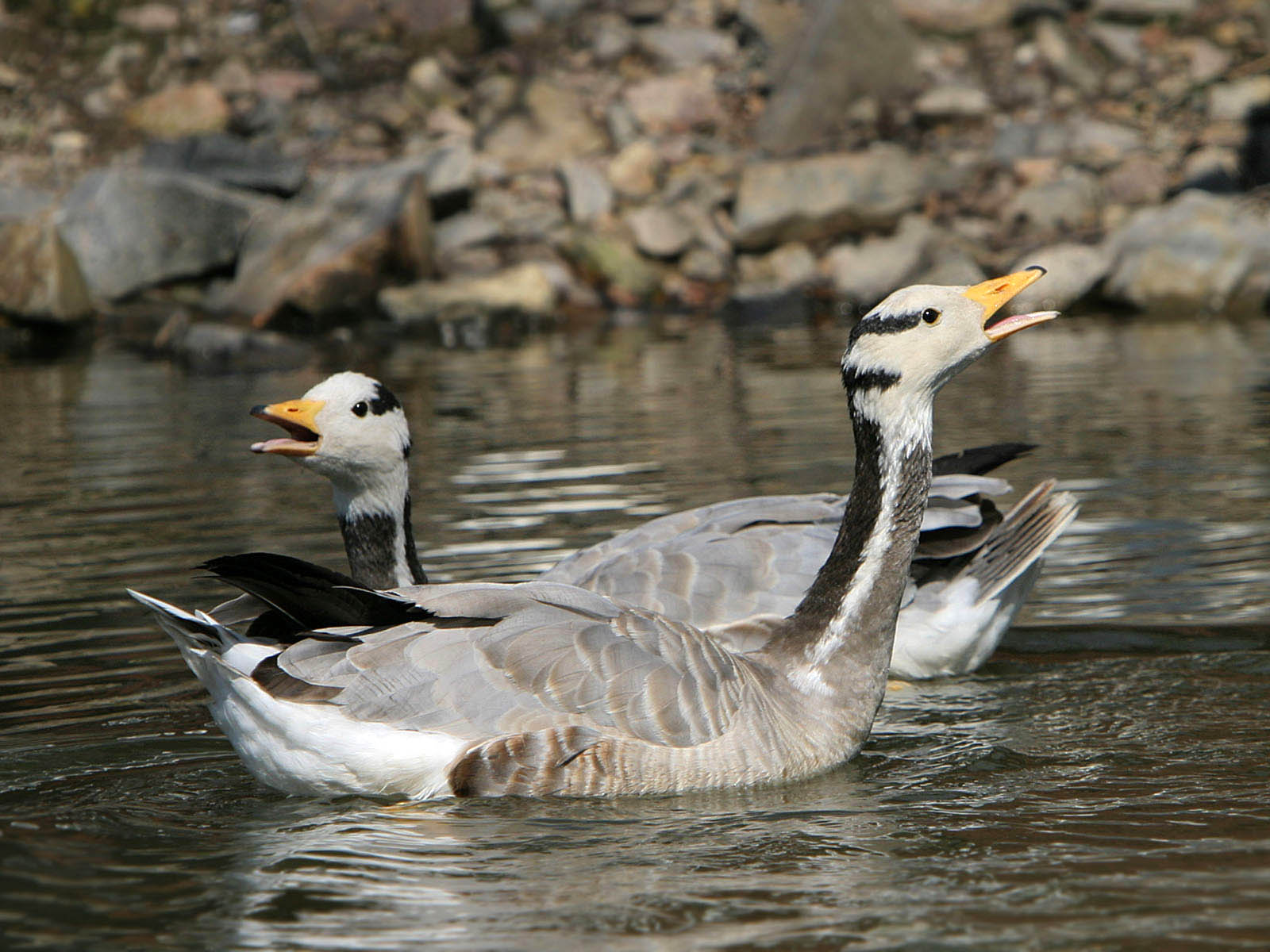 Zwei aufgeregte Streifengänse (Anser indicus) im Tierpark Limbach-Oberfrohna.
